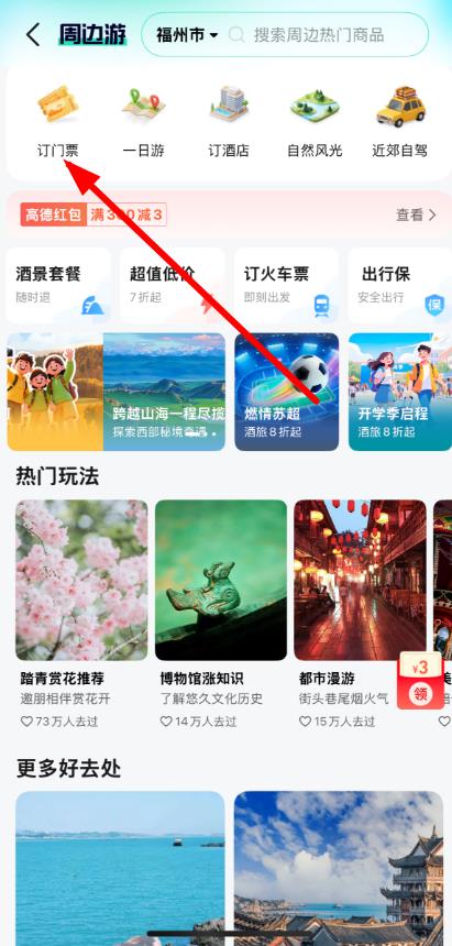 3、进入周边游页面后,点击订门票选项,然后根据提示选择想要预订门票的景点并完成订票操作。
