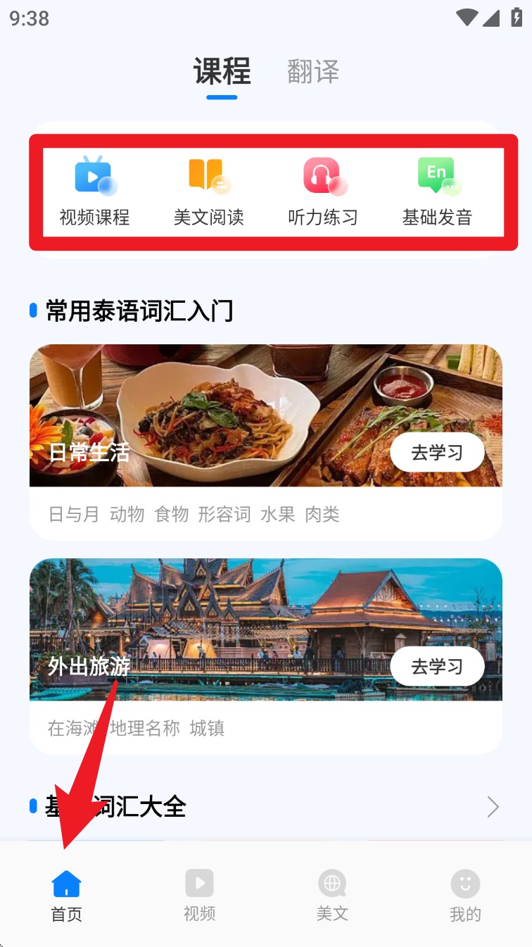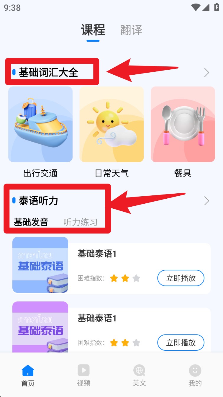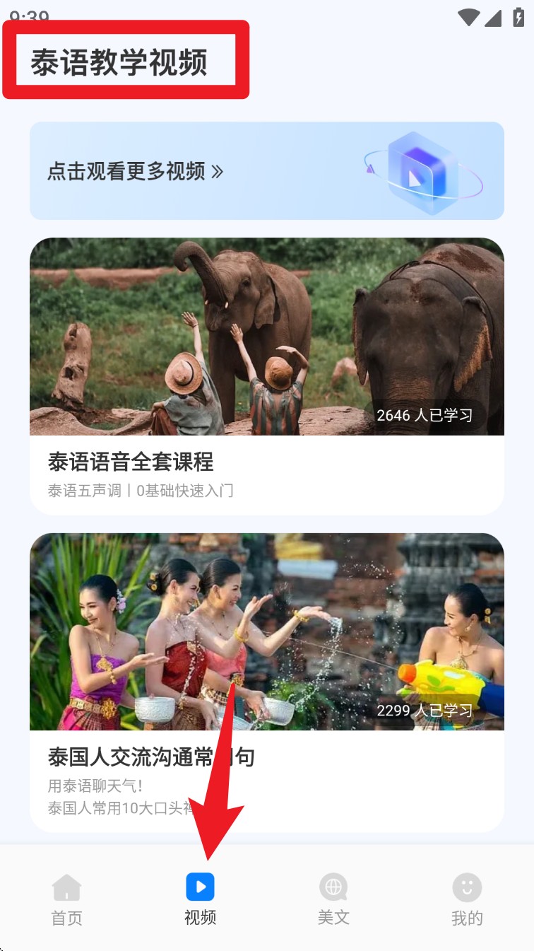 5、若要观看教学视频或文章内容,可分别点击底部「视频」「美文」标签,进入泰语教学视频或阅读推荐文章列表。