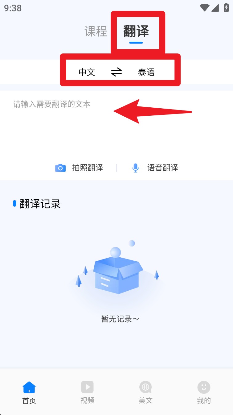 4、在底部导航点击「翻译」,即可进入中文与泰语互译页面,支持输入文本、拍照翻译与语音翻译操作。
