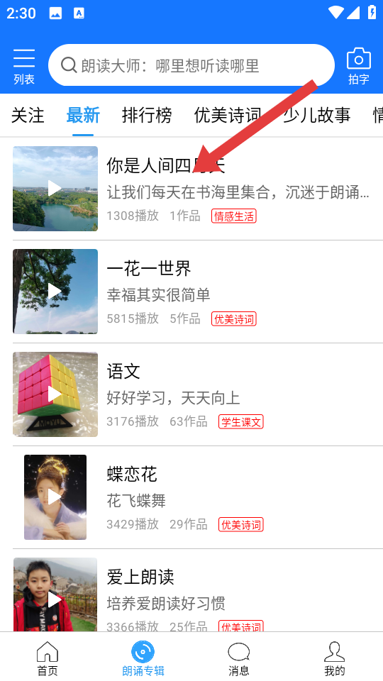 1、打开朗读大师APP,在朗诵专辑页面找到目标专辑如你是人间四月天,点击进入专辑详情页。