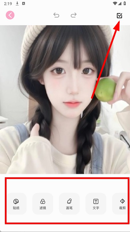 3、使用贴纸,滤镜,画笔等功能编辑图片,完成后点击右上角确认图标保存。