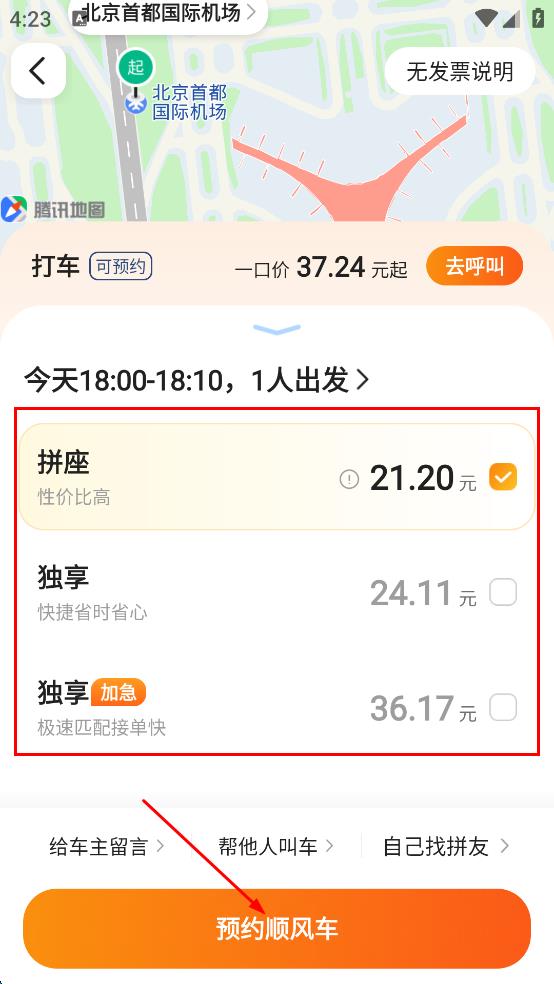 3、在打车类型选择页面,挑选合适的打车类型,如拼座,然后点击“预约顺风车”按钮,即可完成顺风车的预约。