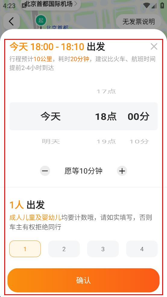 2、目的地输入完成后,进入出发时间和人数设置页面,选择合适的出发时间,再设置出发人数,如1人,设置好后点击“确认”按钮。