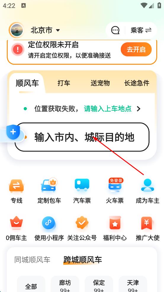 1、打开顺风车软件,在主界面找到“输入市内、城际目的地”的输入框,点击该输入框,输入想要前往的目的地。
