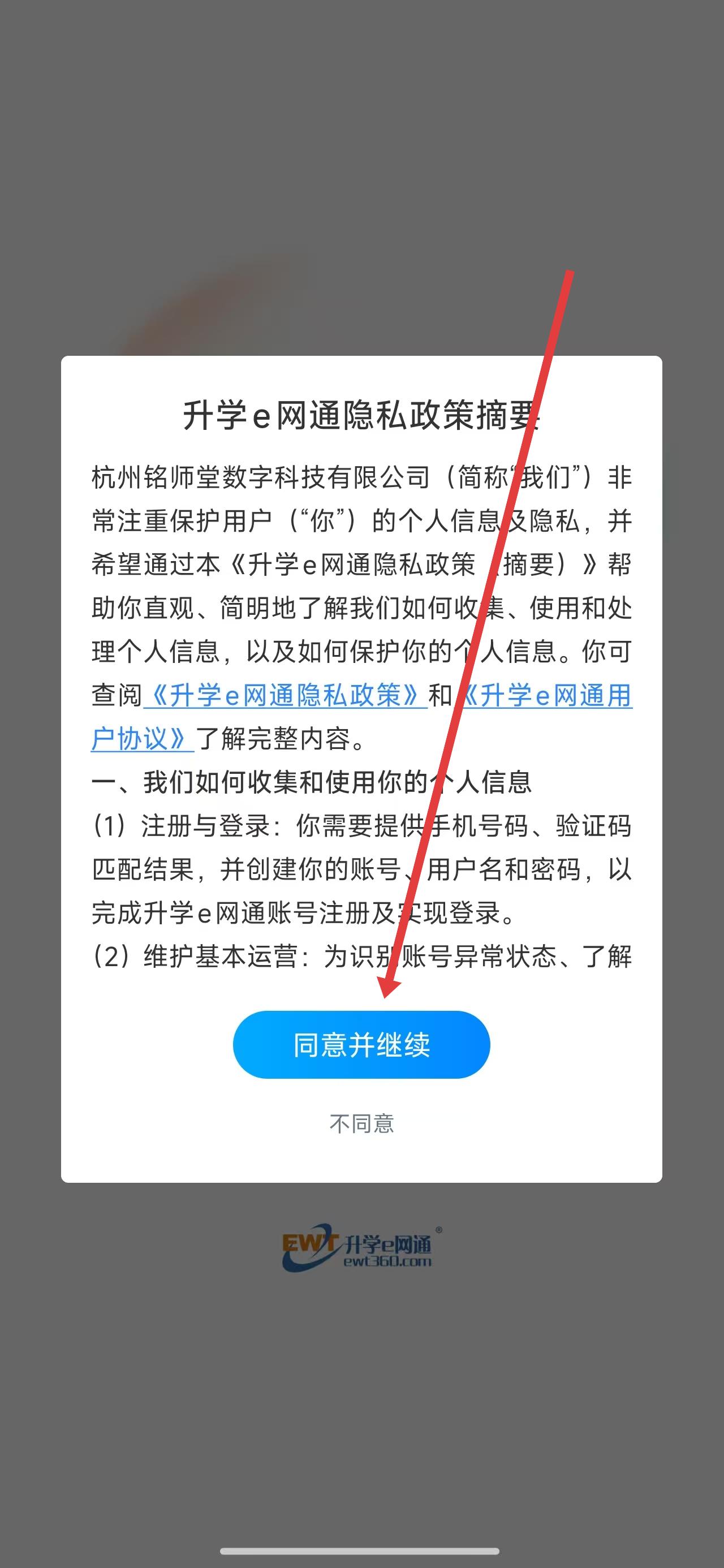 1、打开升学e网通后,通过点击弹窗中的同意并继续按钮,进入使用。