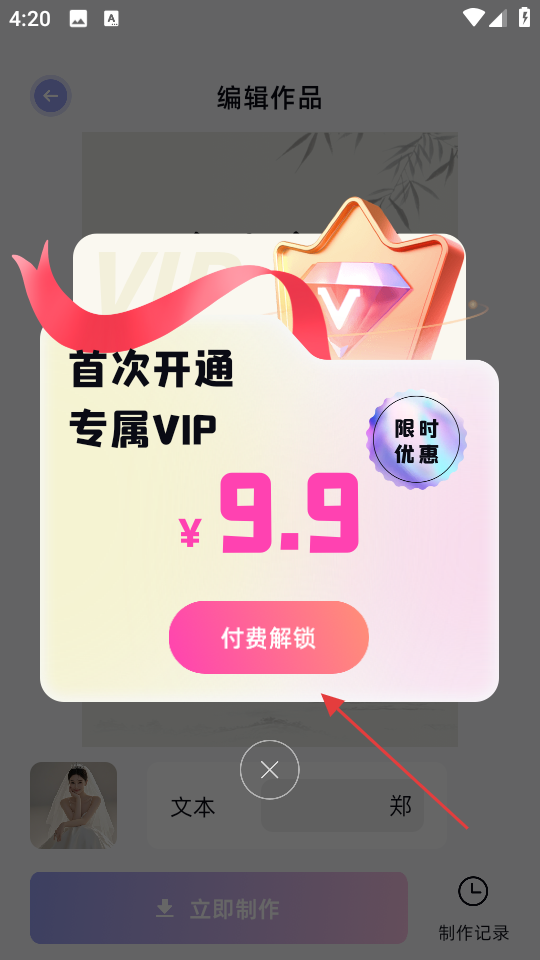 3、若制作该作品需要开通VIP,点击付费解锁即可开通并继续制作。