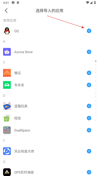 2、在应用列表里找到需要隐藏或双开的应用,点击应用右侧的加号图标。