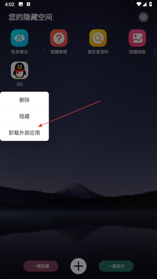 3、返回隐藏空间主界面,长按已导入的应用图标,在弹出的菜单中选择删除外部应用,该应用就会从手机主桌面隐藏。