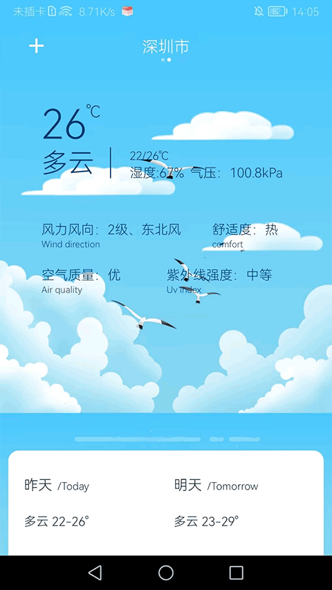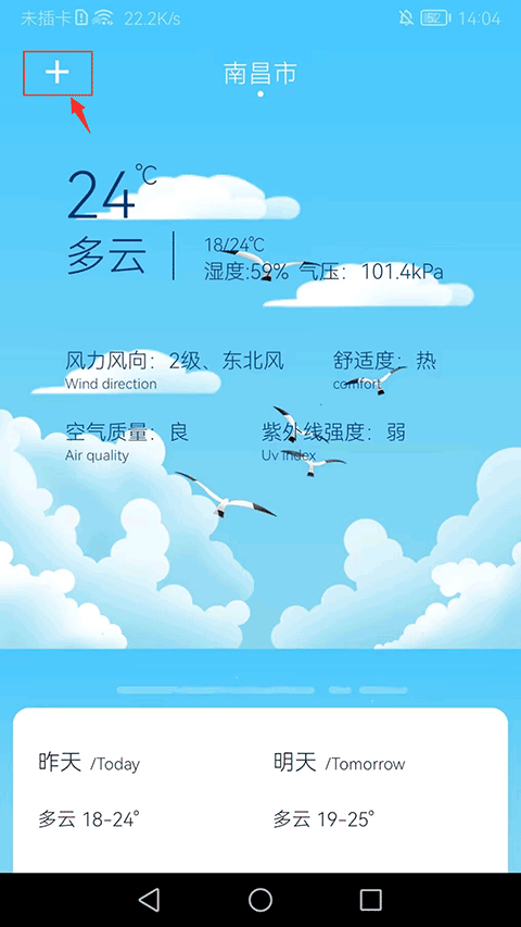 3、如果想要查看自己所在城市的天气状况,可以点击左上角“+”进行城市管理。