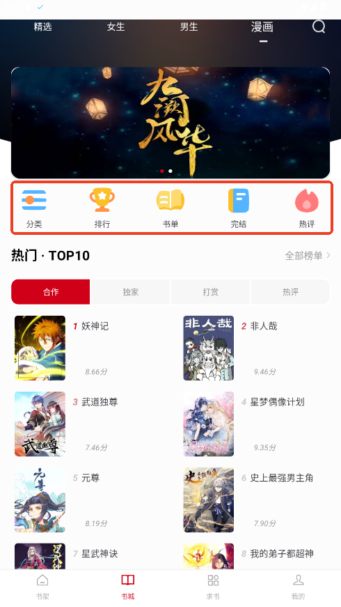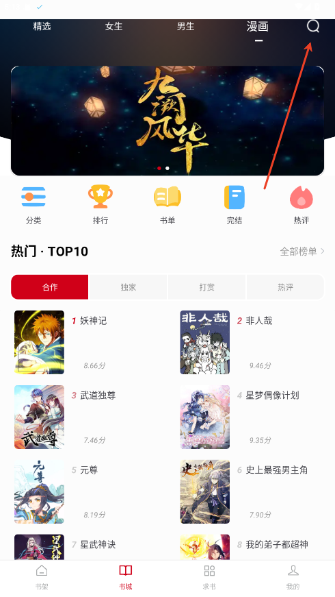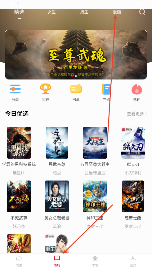 1、在书城内点击上方漫画按钮