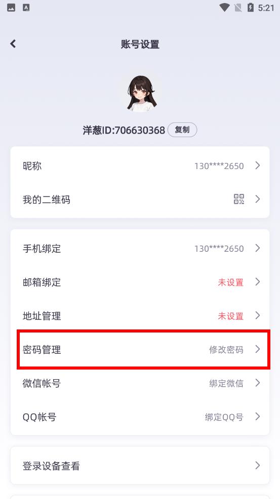 2、在账号设置界面中找到密码管理选项并点击进入密码修改流程。