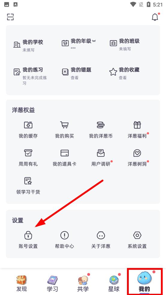 1、打开洋葱学园APP点击最右侧我的按钮进入个人中心页面,在设置板块里点击账号设置选项。