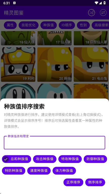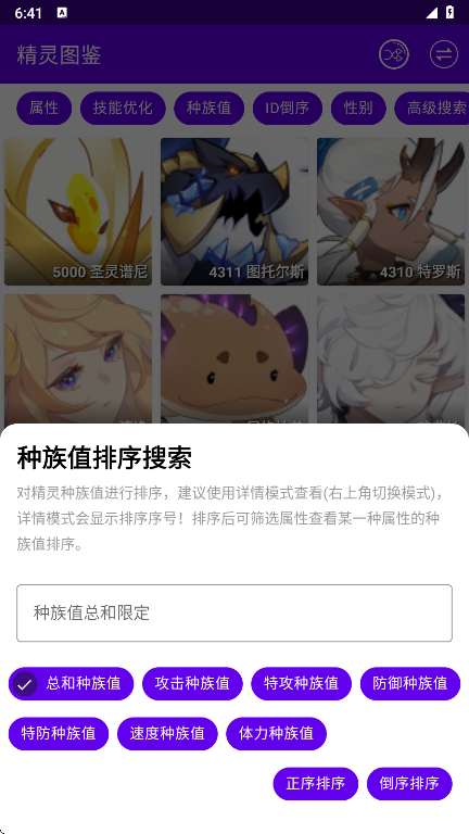 3、想要快速找到自己想要了解的精灵可以按照特定条件搜索,比如种族值