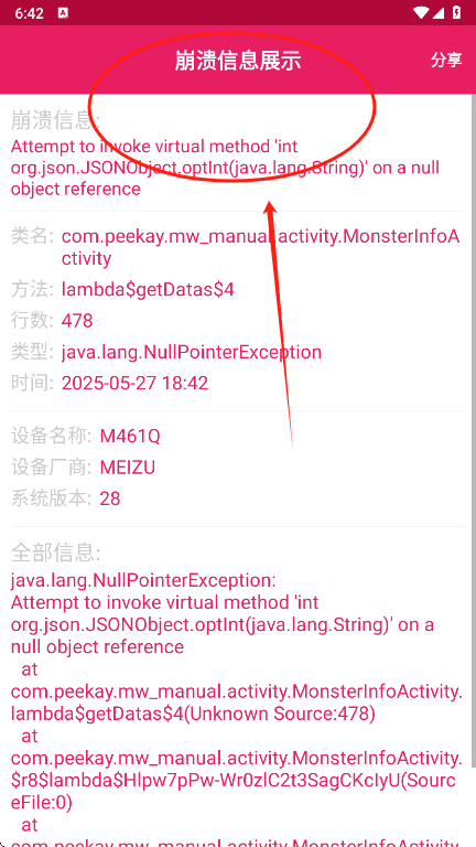 2、点击精灵信息信息的时候会崩溃,提示字符,如图所示