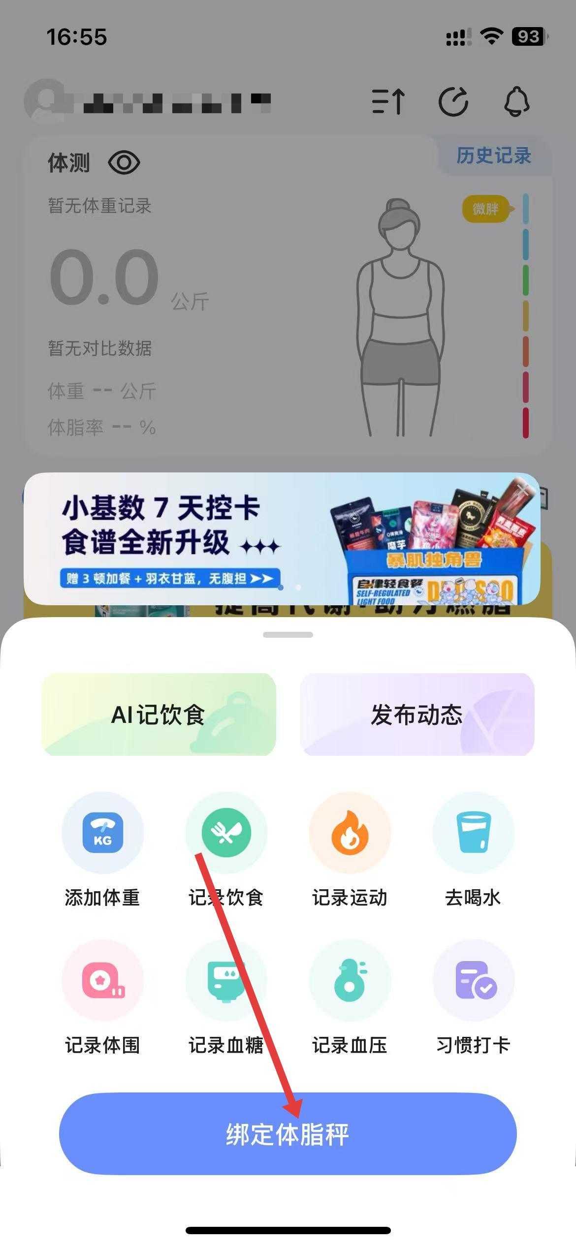 2、在点击+号后弹出的界面中,找到并点击绑定体脂秤按钮,准备进行体脂秤连接操作。