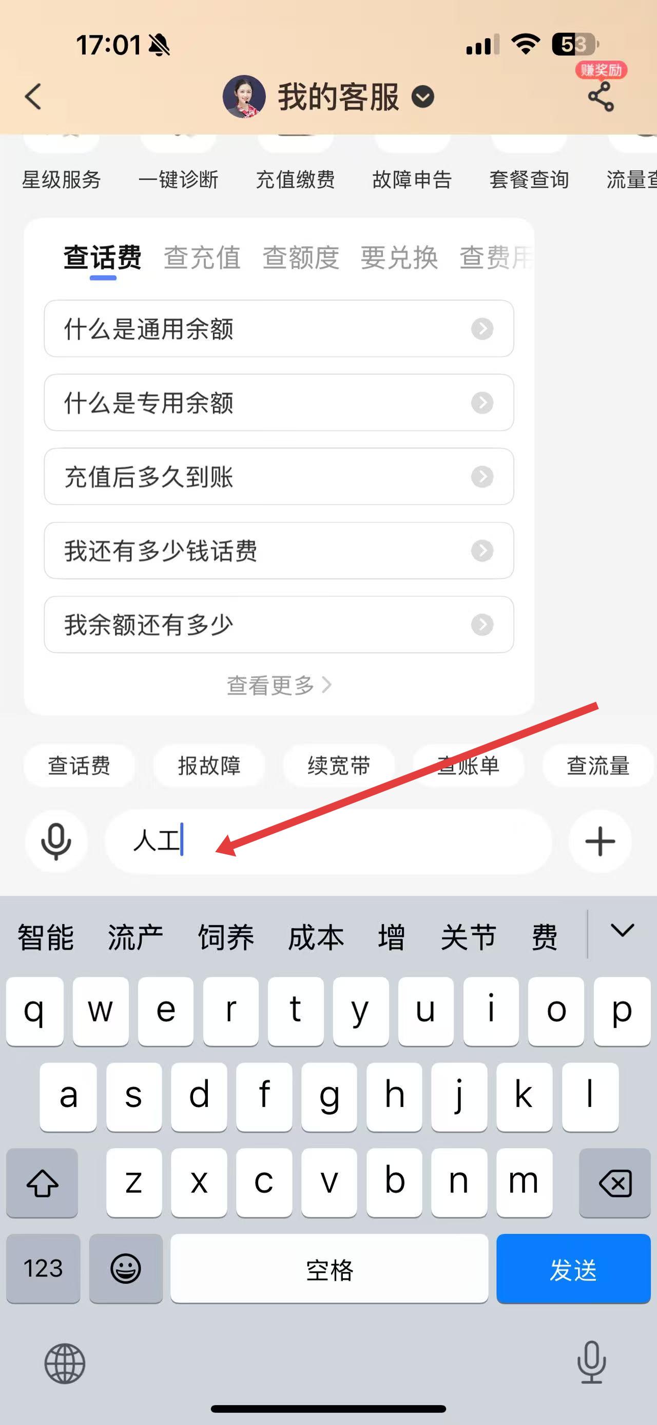 2、在我的客服界面下方的输入框中,输入关键词人工。