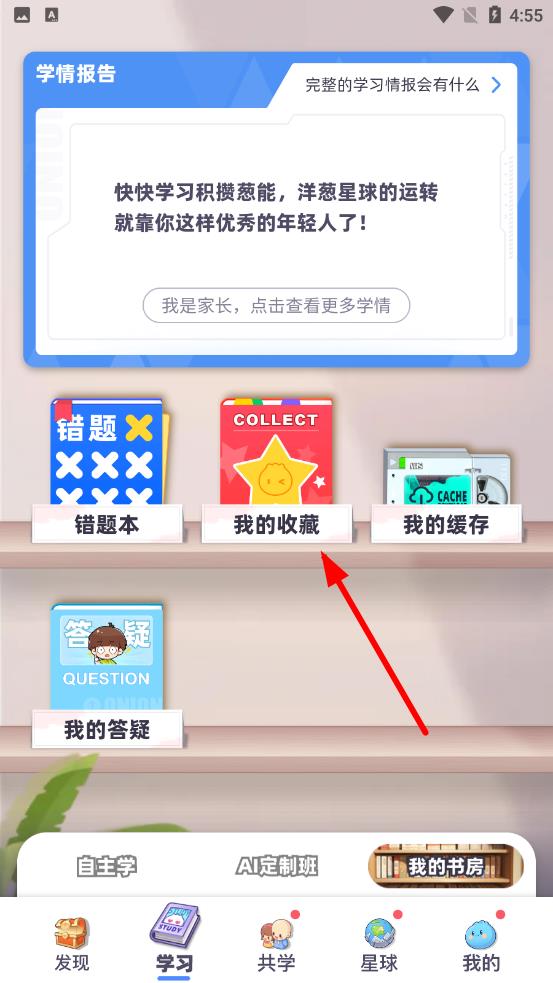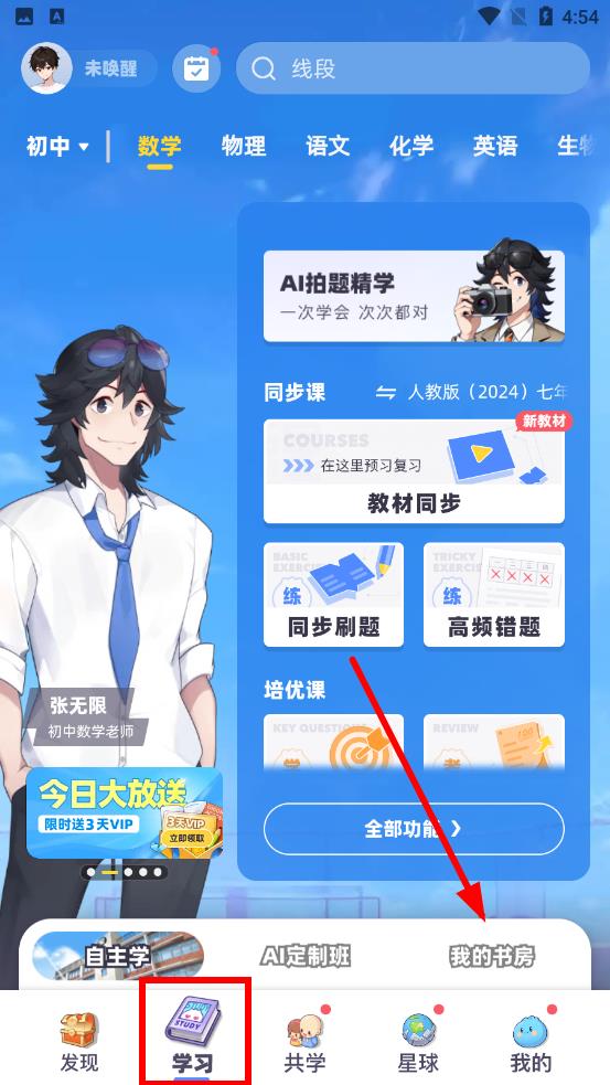 1、进入软件界面后点击底部导航栏中的学习按钮,在页面点击下方的我的书房。