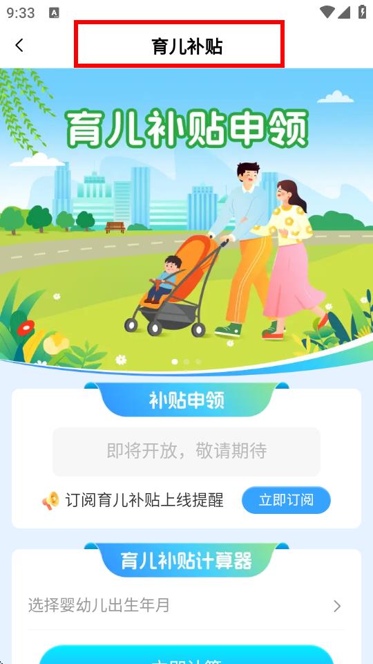 3、进入育儿补贴页面后,当前显示补贴申领即将开放,选择婴幼儿出生年月后按提示操作计算补贴。