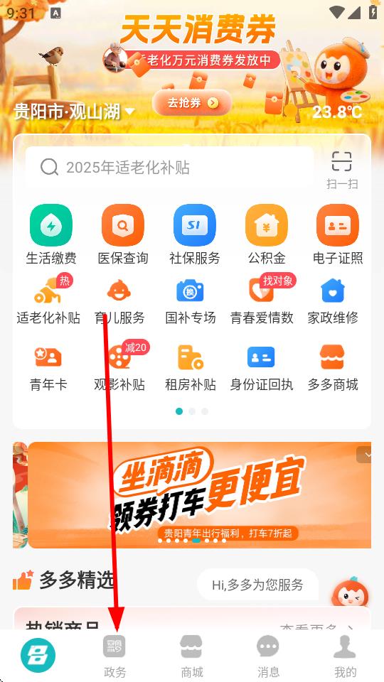 1、打开多彩宝App,点击底部导航栏中的政务选项进入政务页面。
