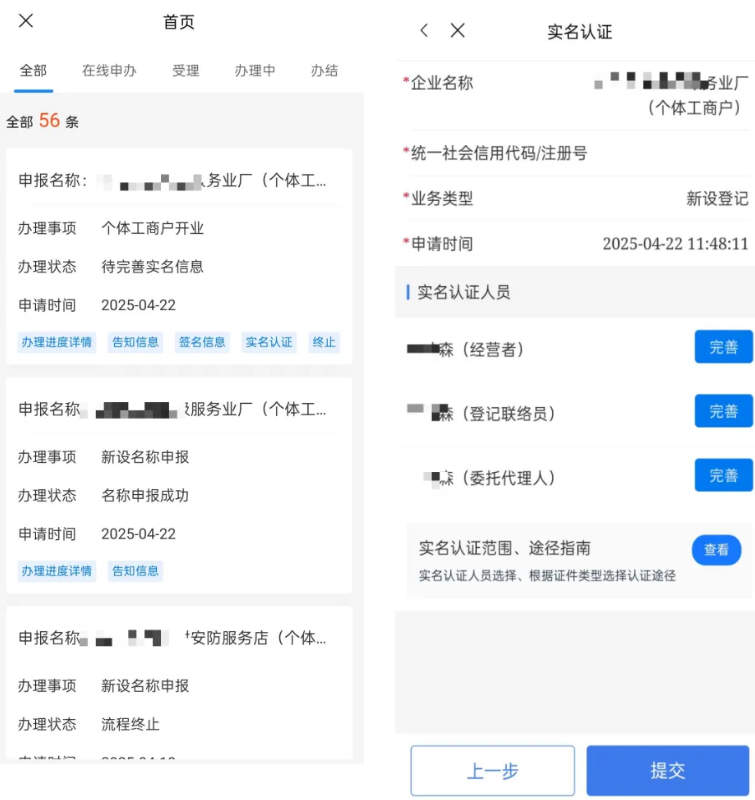 6.查询“我的办件”,点击“实名认证”→“完善”,录入“国别”后提交。