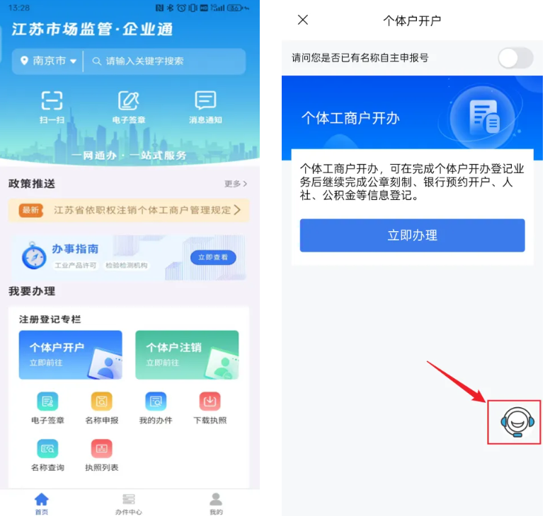 1.由代理人(可由参与经营的家庭成员担任)打开“企业通”APP,使用苏服办APP授权登录。
