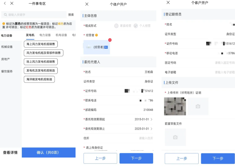 5.填好营业执照登记内容后点击“下一步”,进入公章刻制、银行预约开户、社保办理、公积金登记环节(不需要的可默认跳过),最后确认提交。