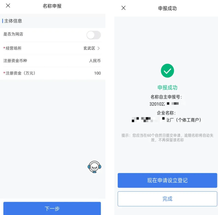 在申报之前,可先用“名称申报”功能单独申报名称(注:名称实行自主申报制,无人工干预,但正式登记可能因不符合规定被驳回,未确认前请勿制作标牌,避免损失)。 如有疑问可咨询在线客服。