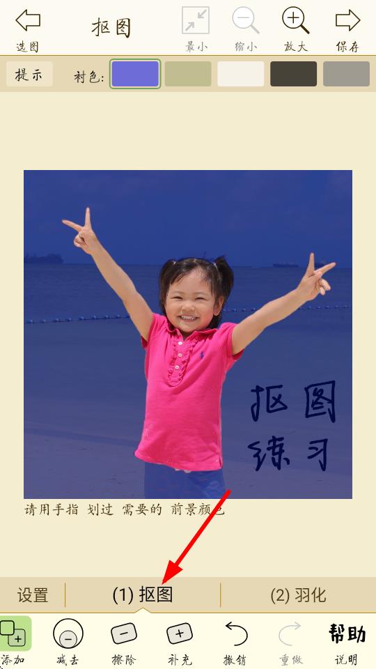 3、进入抠图界面后,使用擦除、补充等工具细致处理图片。