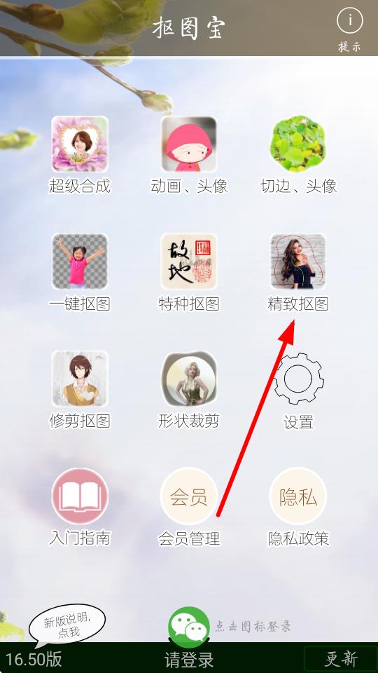 1、打开抠图宝应用,点击精致抠图进入抠图操作页面。