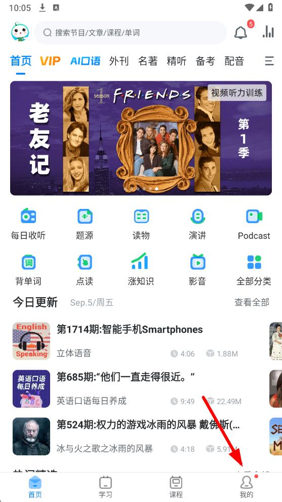 1、打开可可英语应用进入首页,点击底部导航栏中我的选项,进入个人页面。