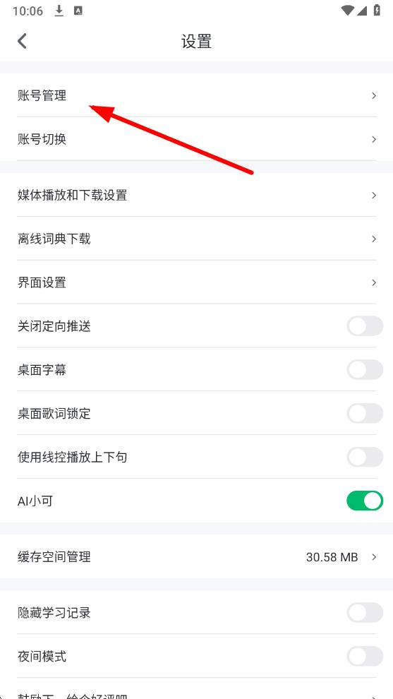 3、在设置界面里,点击账号管理选项,进入账号管理页面。