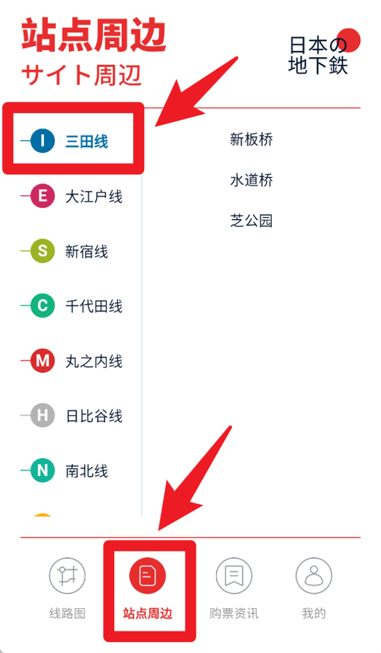 2、选择“站点周边”查看相关站点的信息,不同线会跳转出所属站点可供点选。