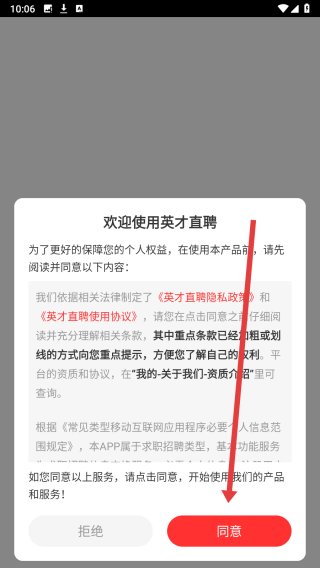 1、打开英才直聘app后,点击弹窗中的同意按钮,进入使用。