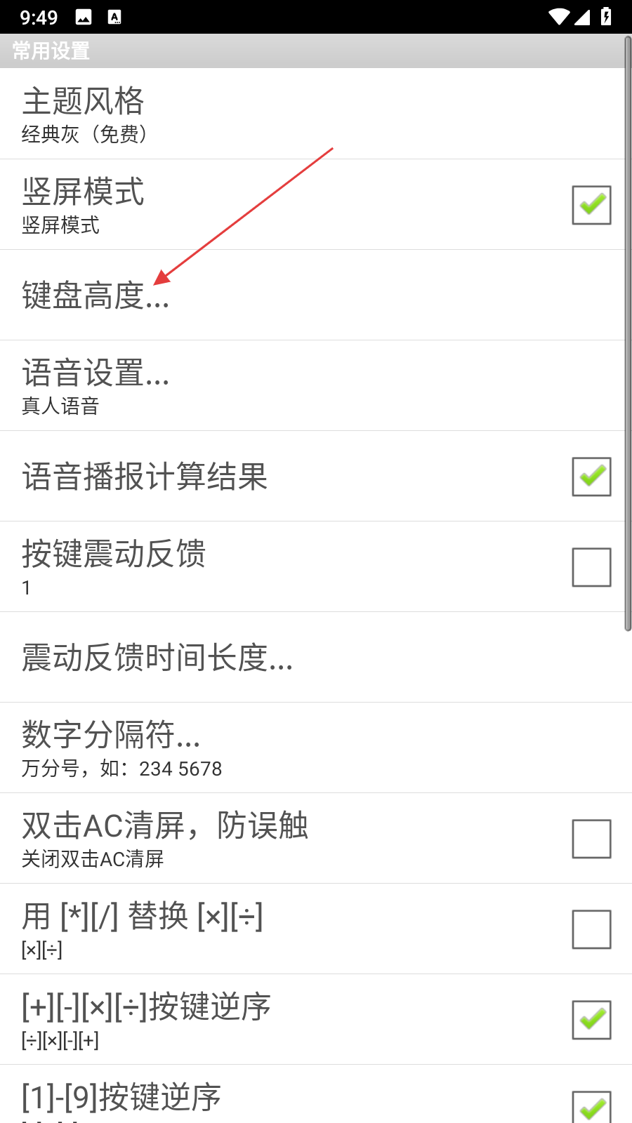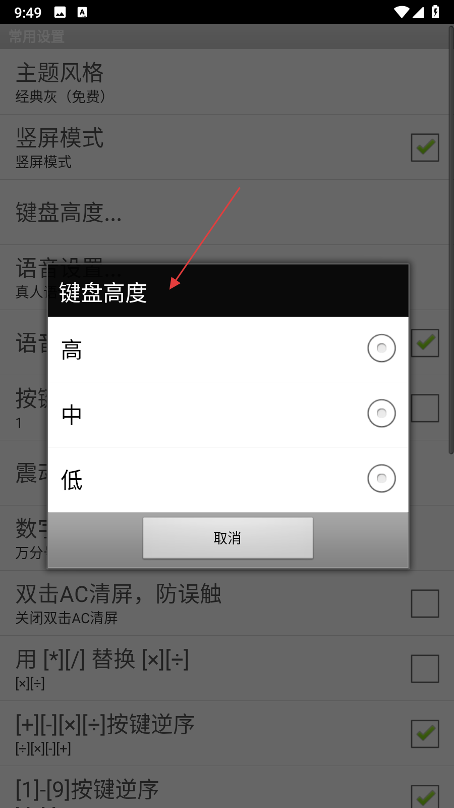 3、在常用设置界面中,找到键盘高度选项并点击,弹出键盘高度选择窗口,窗口内显示高,中,低三个选项。