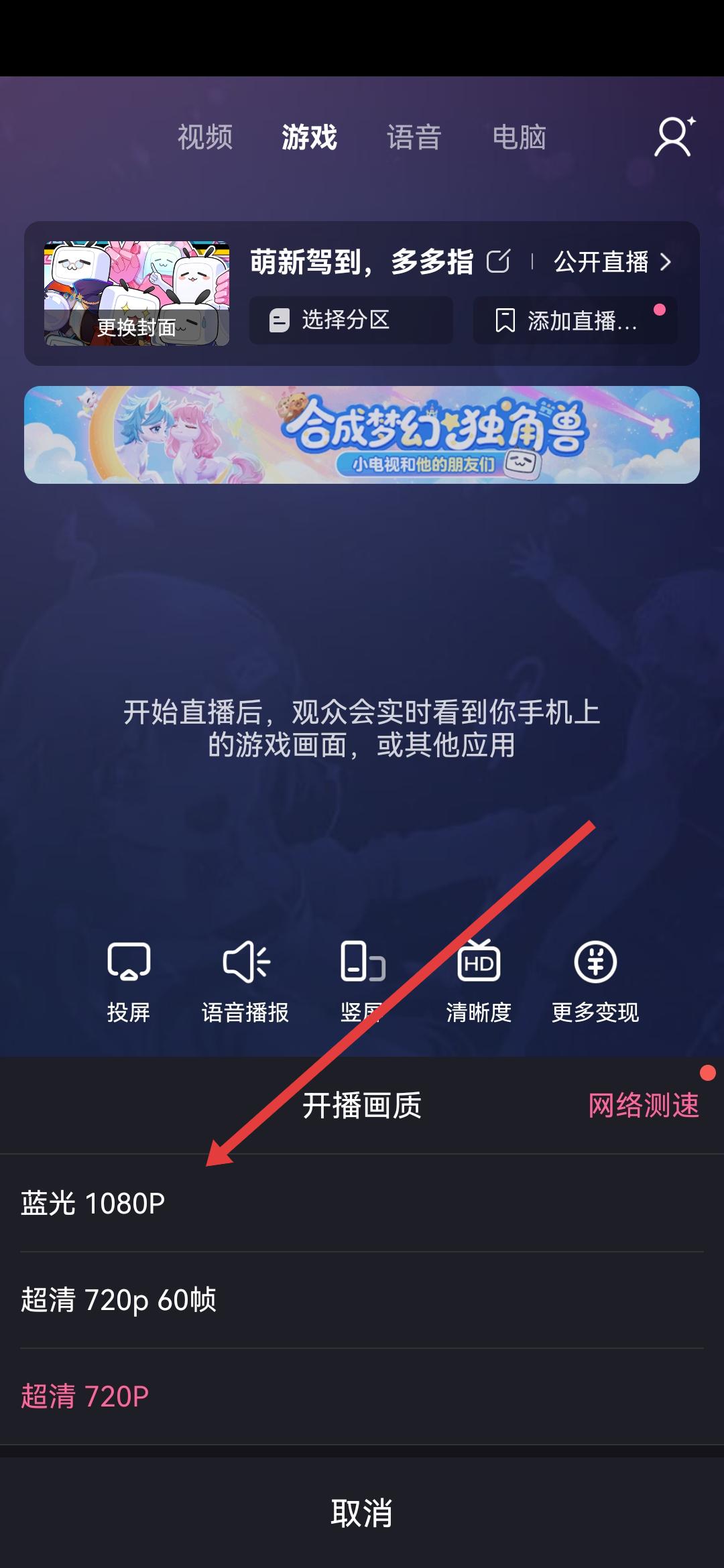 2、在弹出的开播画质列表中,可以选择想要的画质如蓝光1080P等。