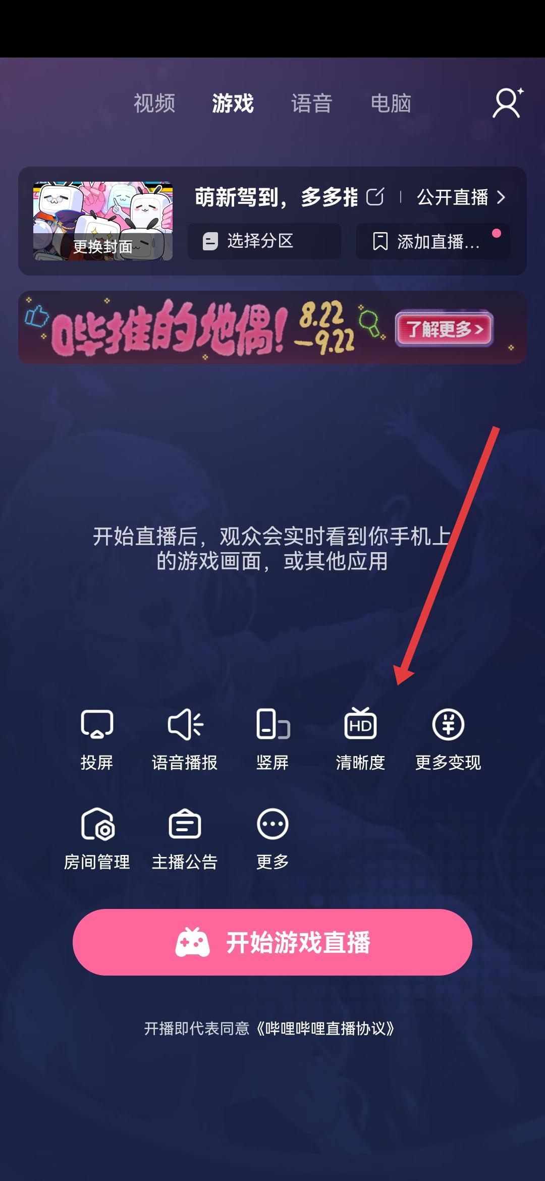 1、打开哔哩哔哩直播姬,进入游戏直播设置界面,点击清晰度的选项。
