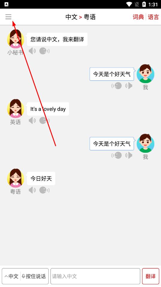 1、打开同声翻译超级版App,点击界面左上角的三条横线图标,打开侧边栏菜单。