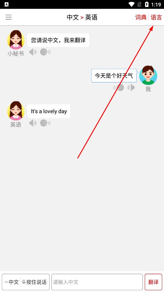 1、打开同声翻译超级版App,在界面右上角找到并点击“语言”选项。