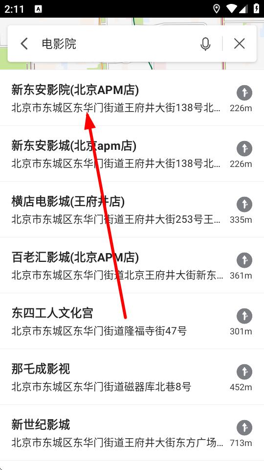 2、在搜索结果中选择具体地点,如新东安影院北京APM店。