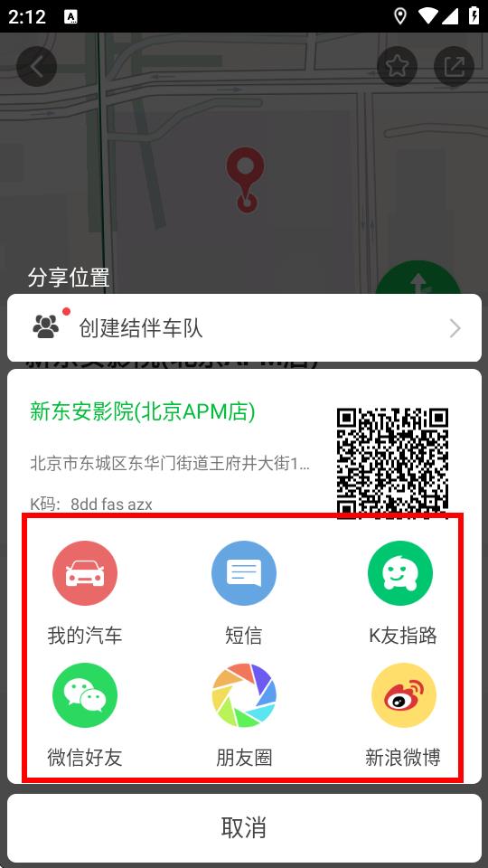 4、在弹出分享选项中,可选择通过我的汽车、短信、K友指路、微信好友、朋友圈、新浪微博等方式分享路线信息。