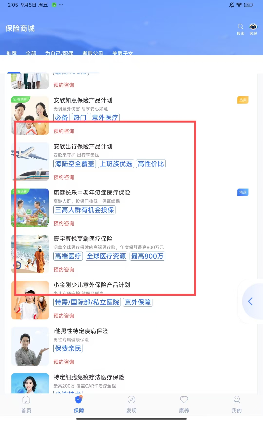 2、进入保障页面后,浏览各类保险产品,选择感兴趣的产品。