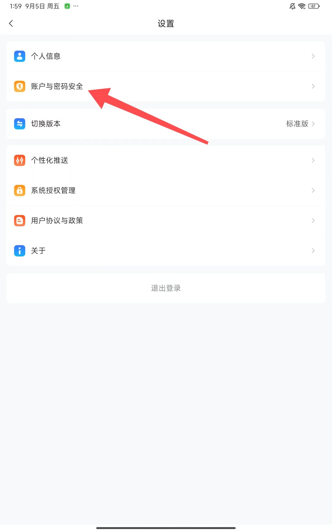 3、在设置页面中找到账户与密码安全选项并点击进入。