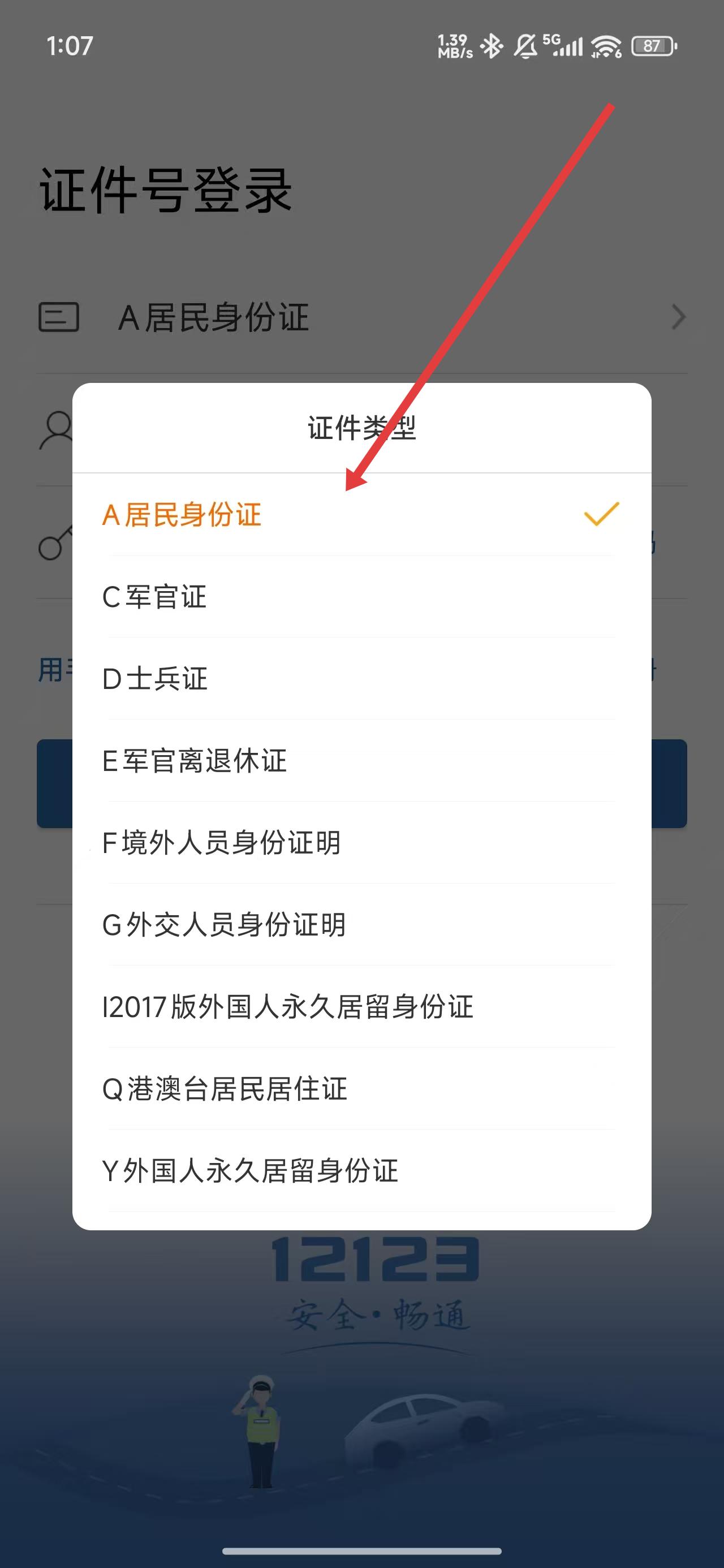 3、在选择证件类型中,点击选择使用居民身份证用来登录。