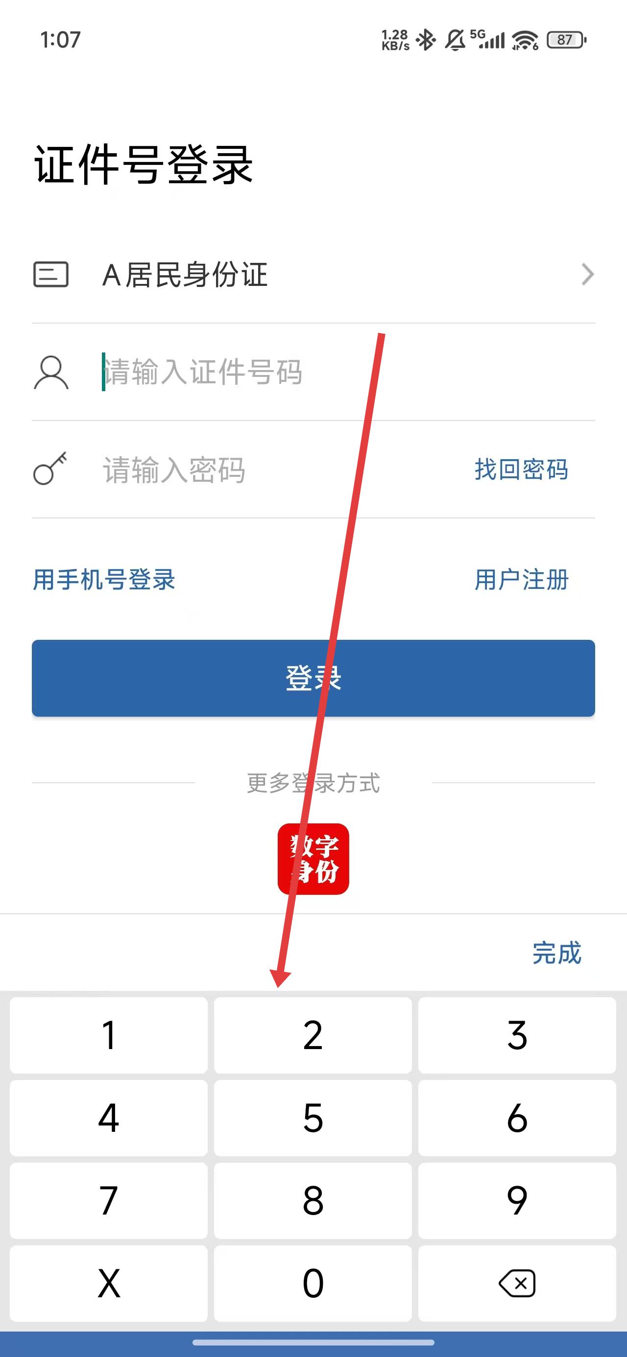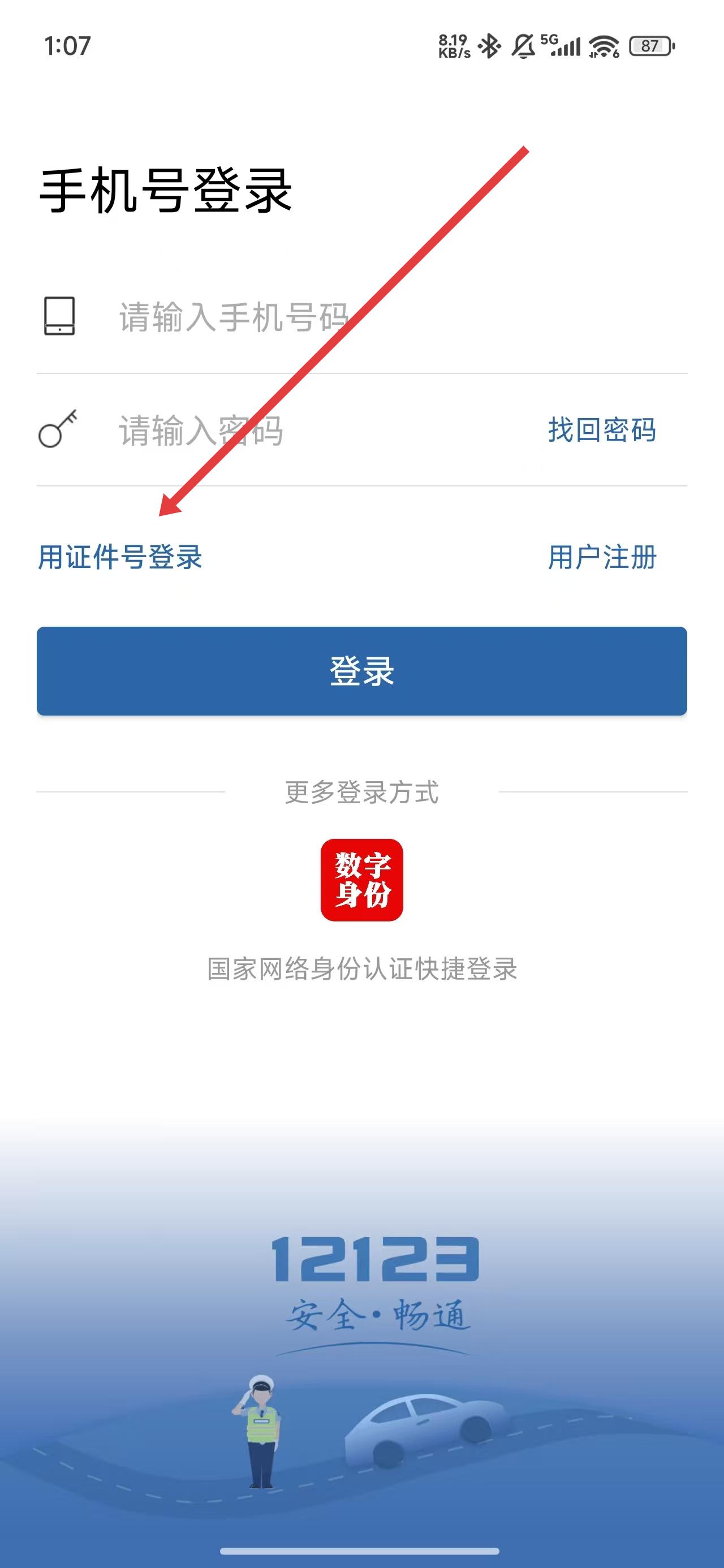 2、在进入到登录页面时,可以点击用证件号登录按钮,切换登录方式。
