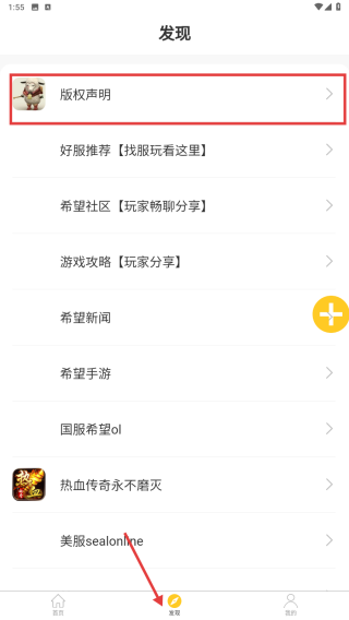 2、点击底部发现选项,可查看版权声明、好服推荐、希望社区等内容。
