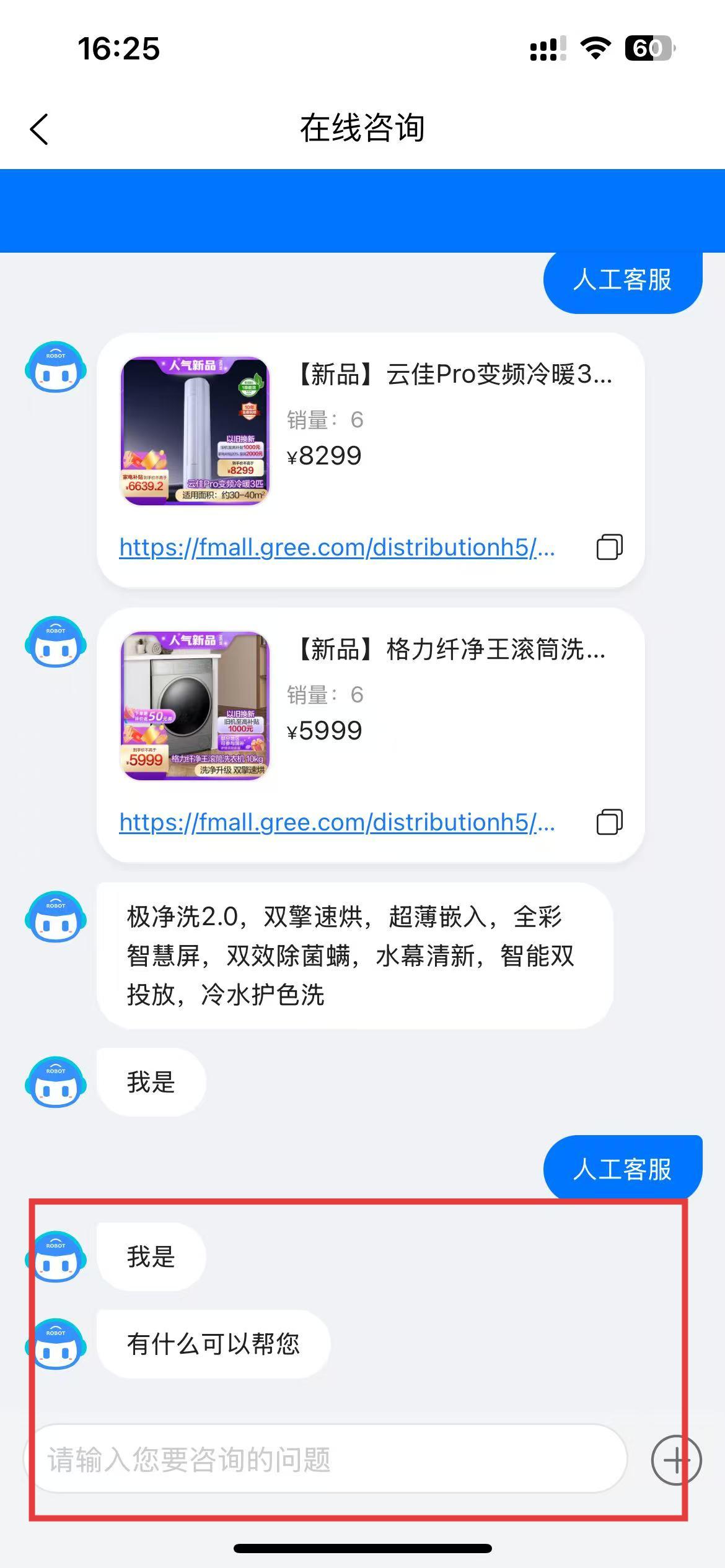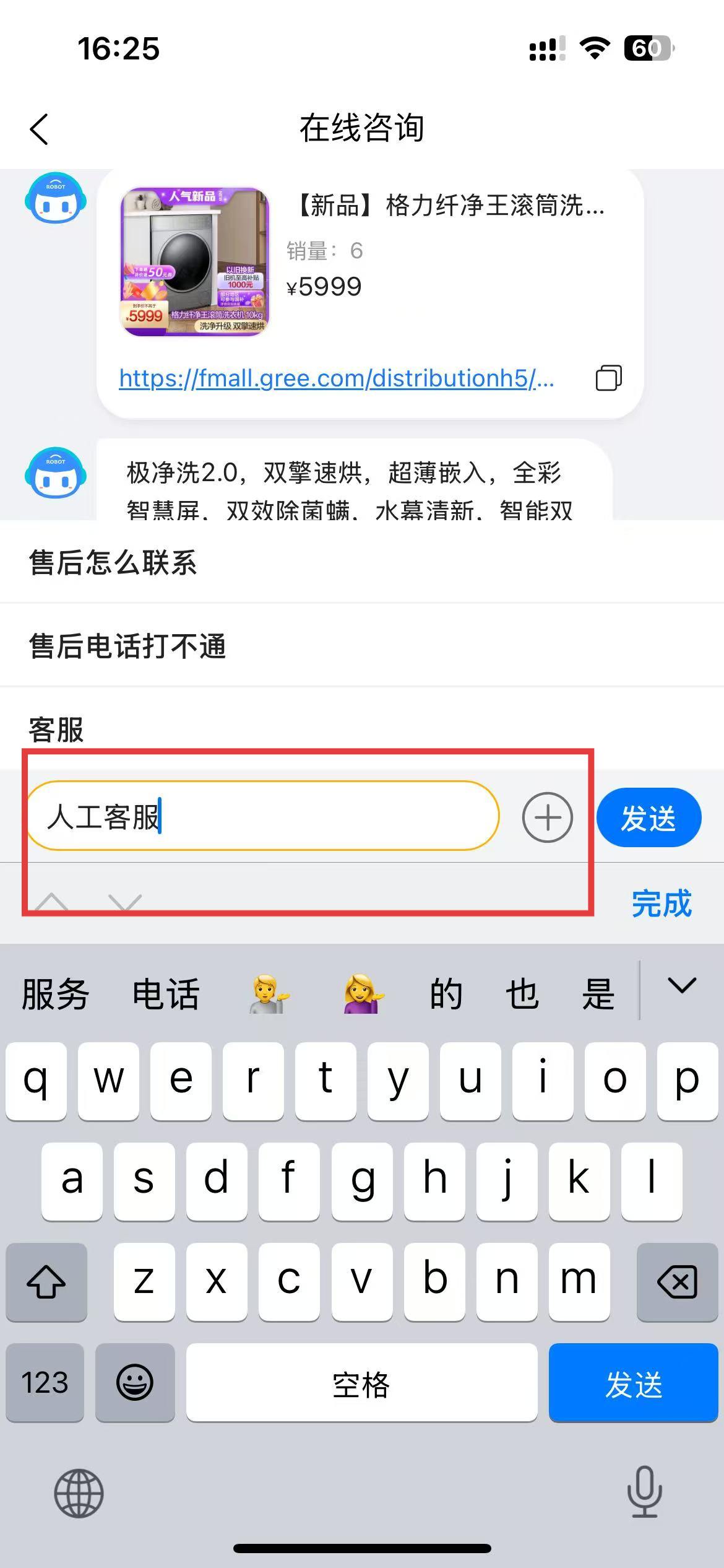 3、在线咨询界面的输入框中,输入人工客服,然后点击发送。