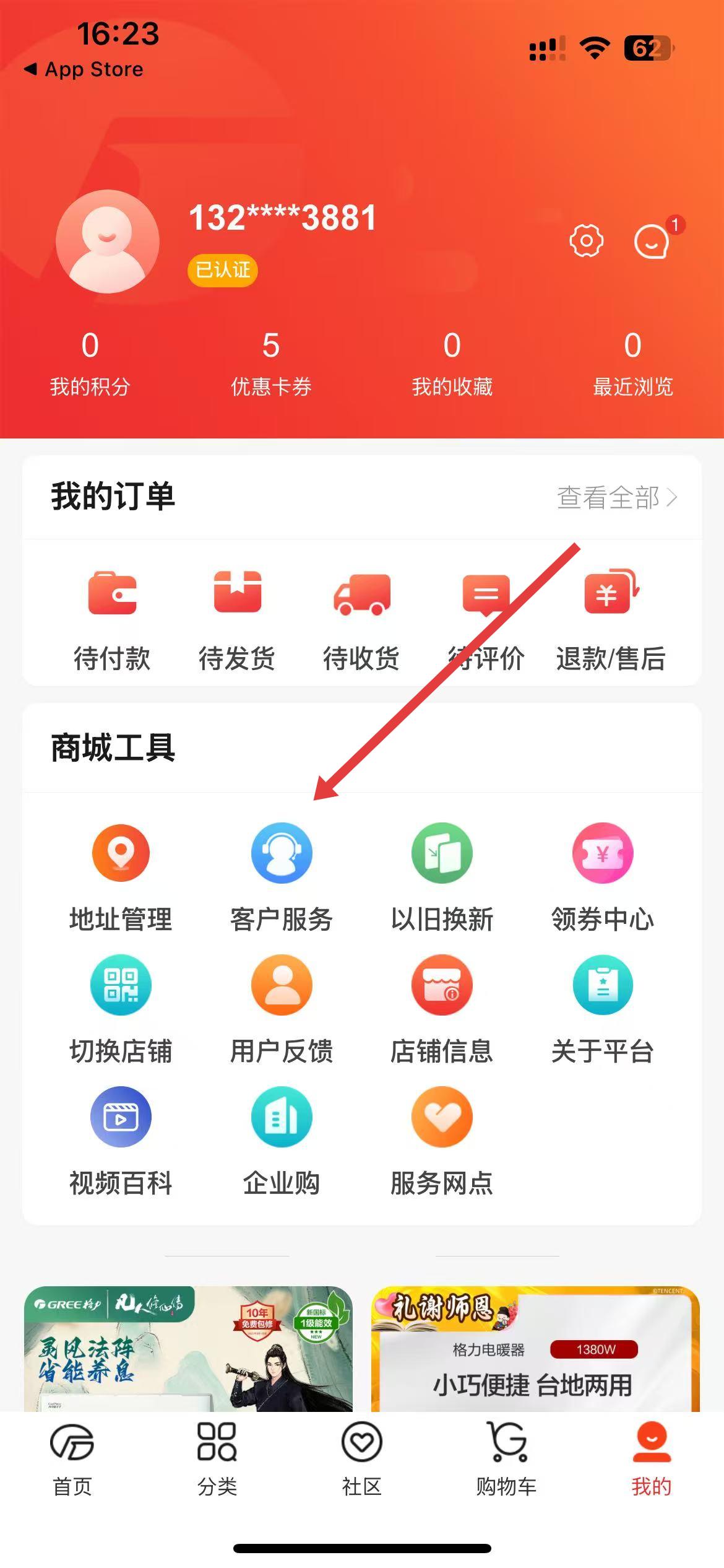 2、在个人中心页面中找到商城工具板块,点击其中的客户服务选项,进入在线咨询界面。