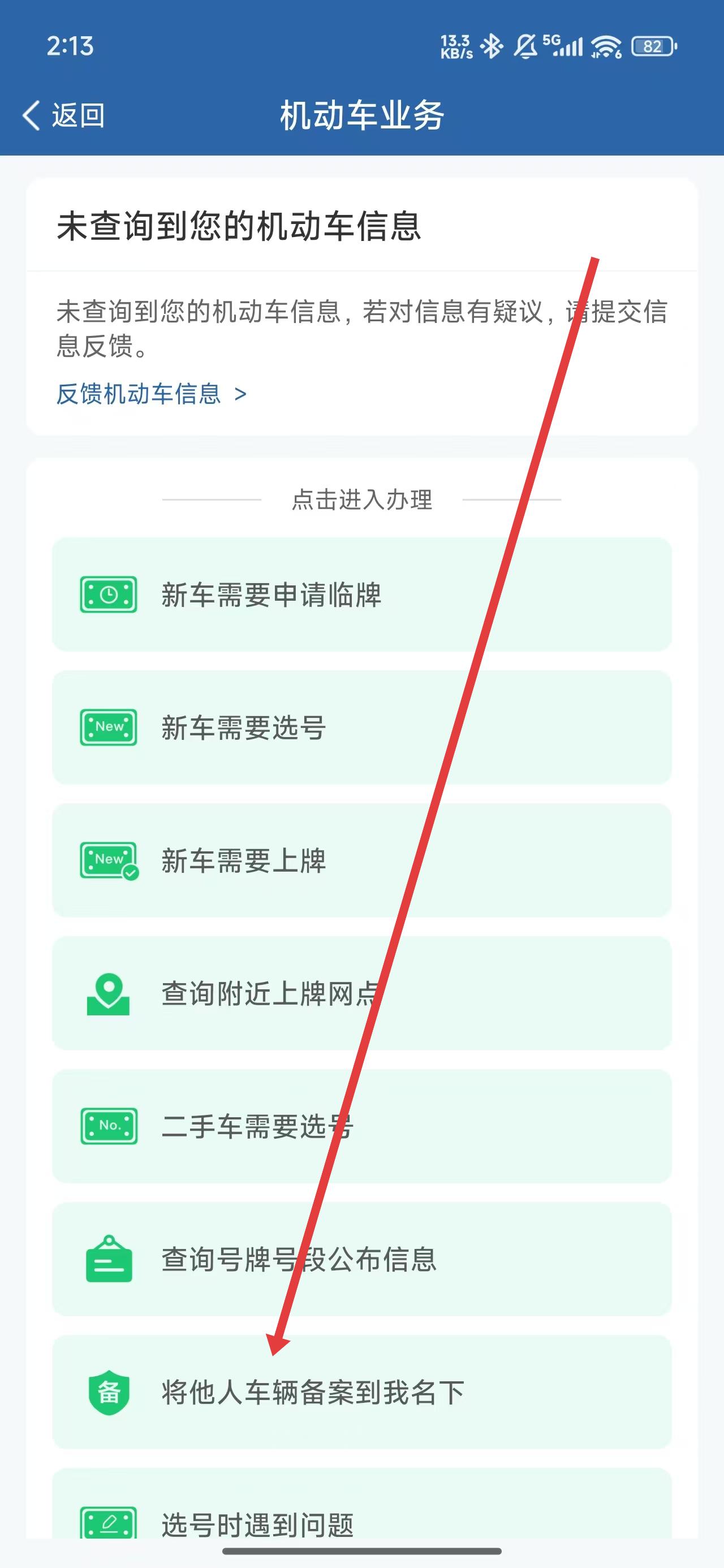 2、点击将他人车辆备案到我名下选项,进入办理操作。