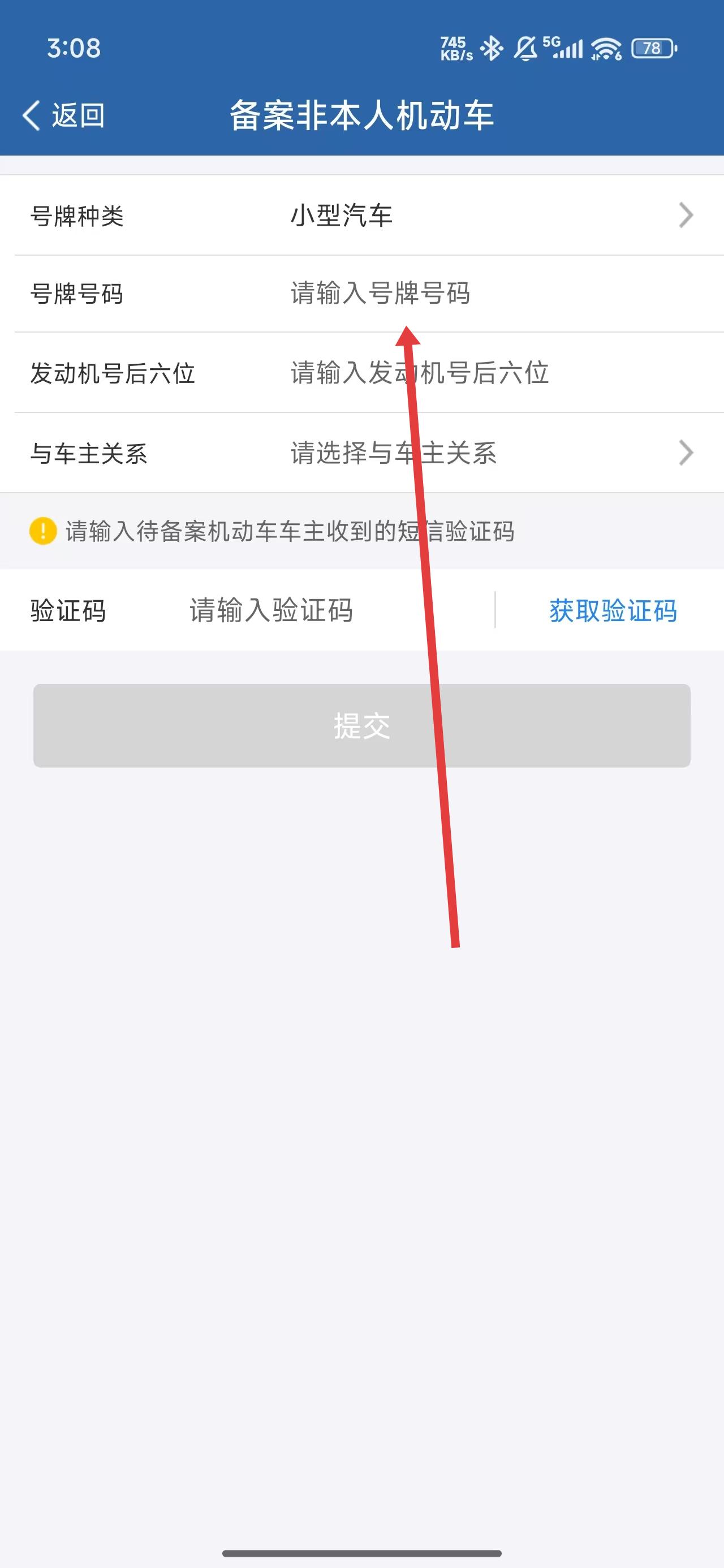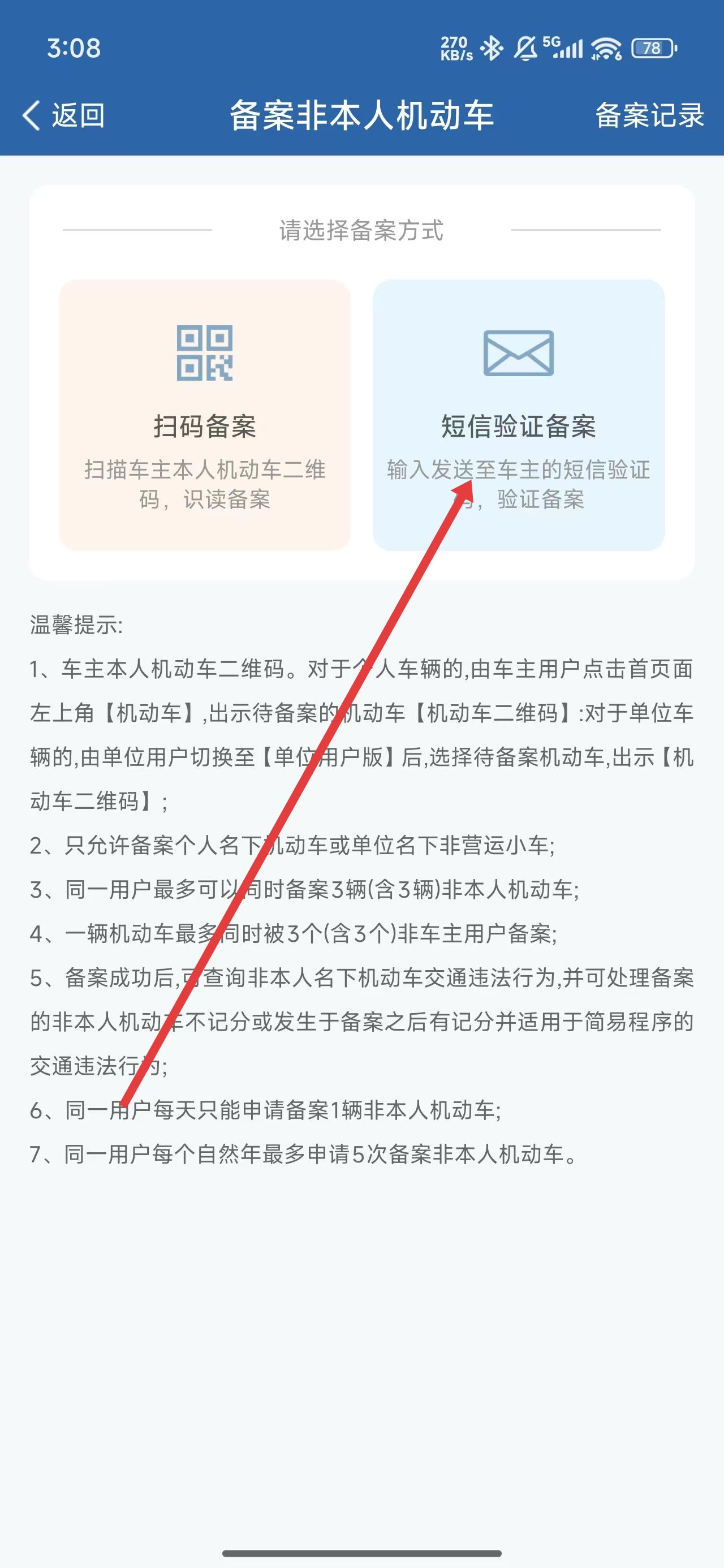 3、在进入到备案非本人机动车页面中,可以点击选择短信验证备案的方式办理。