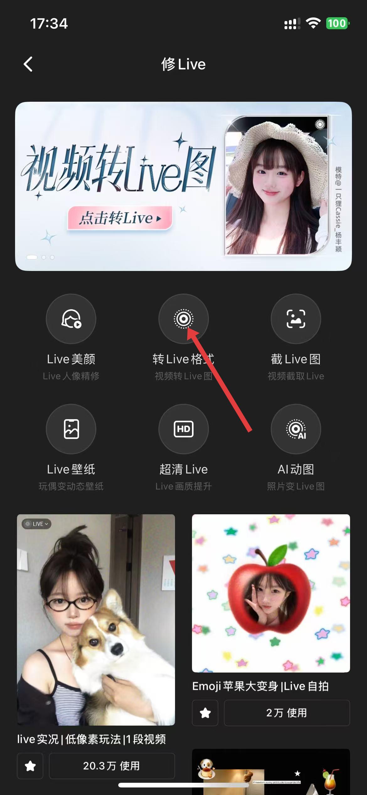 2、点击转Live格式选项,从相册中选择你想要处理的Live图或视频。